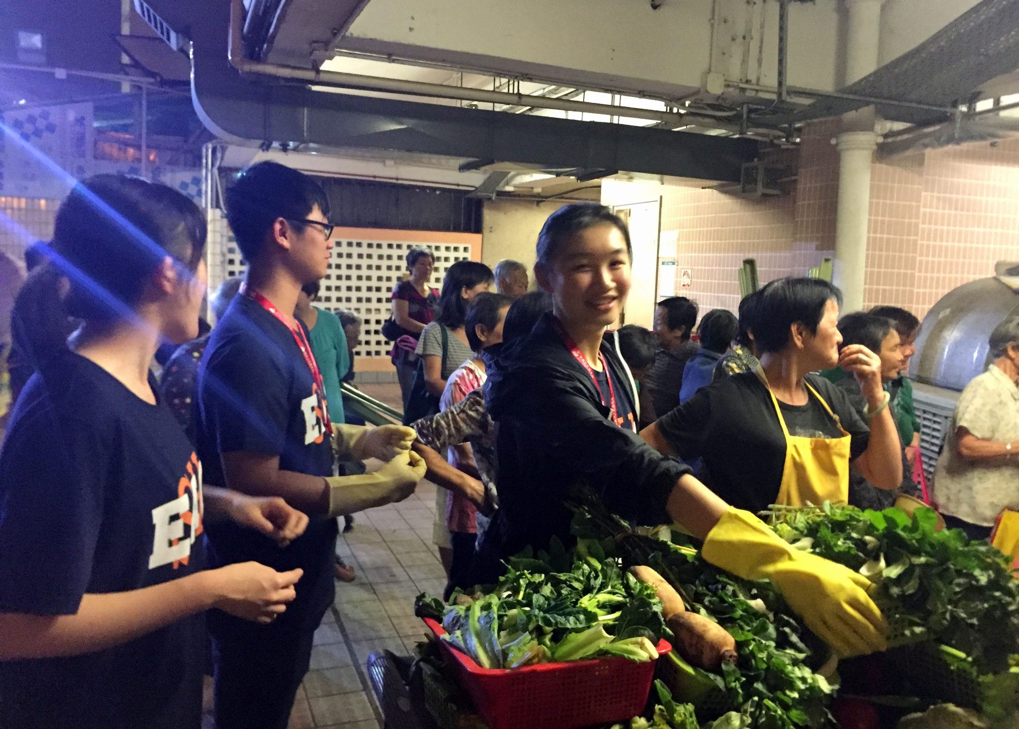 Students redistributing unsold or imperfect vegetables collected from a wet market.