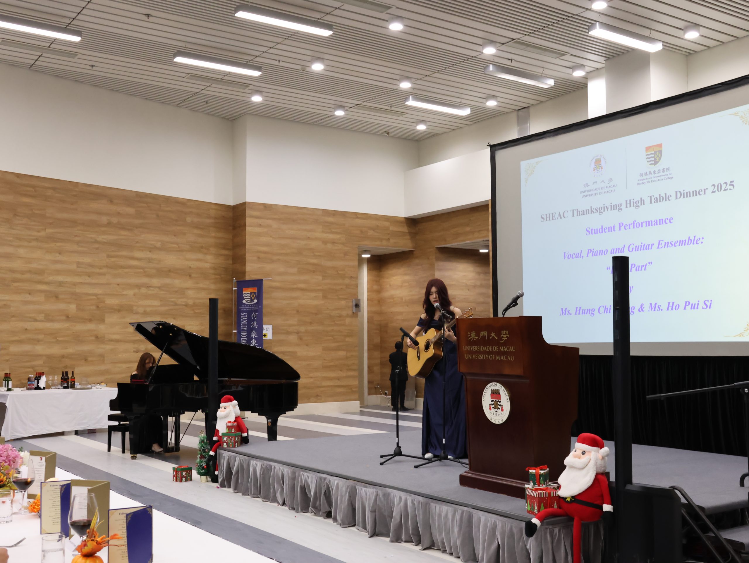 During the dinner, four first-year students delivered wonderful performances that enlivened the atmosphere: Ms. Hung Chi Weng and Ms. Ho Pui Si performed a piano and guitar rendition of Best Part with vocals, while Ms. Erica Lomonaco and Ms. Kyrsten Ashley Ponciano Francisco sang In My Head. Following the performances, guests and students enjoyed dessert and a lively Bingo game, with laughter and cheers filling the hall and enhancing the warm, festive Thanksgiving spirit.