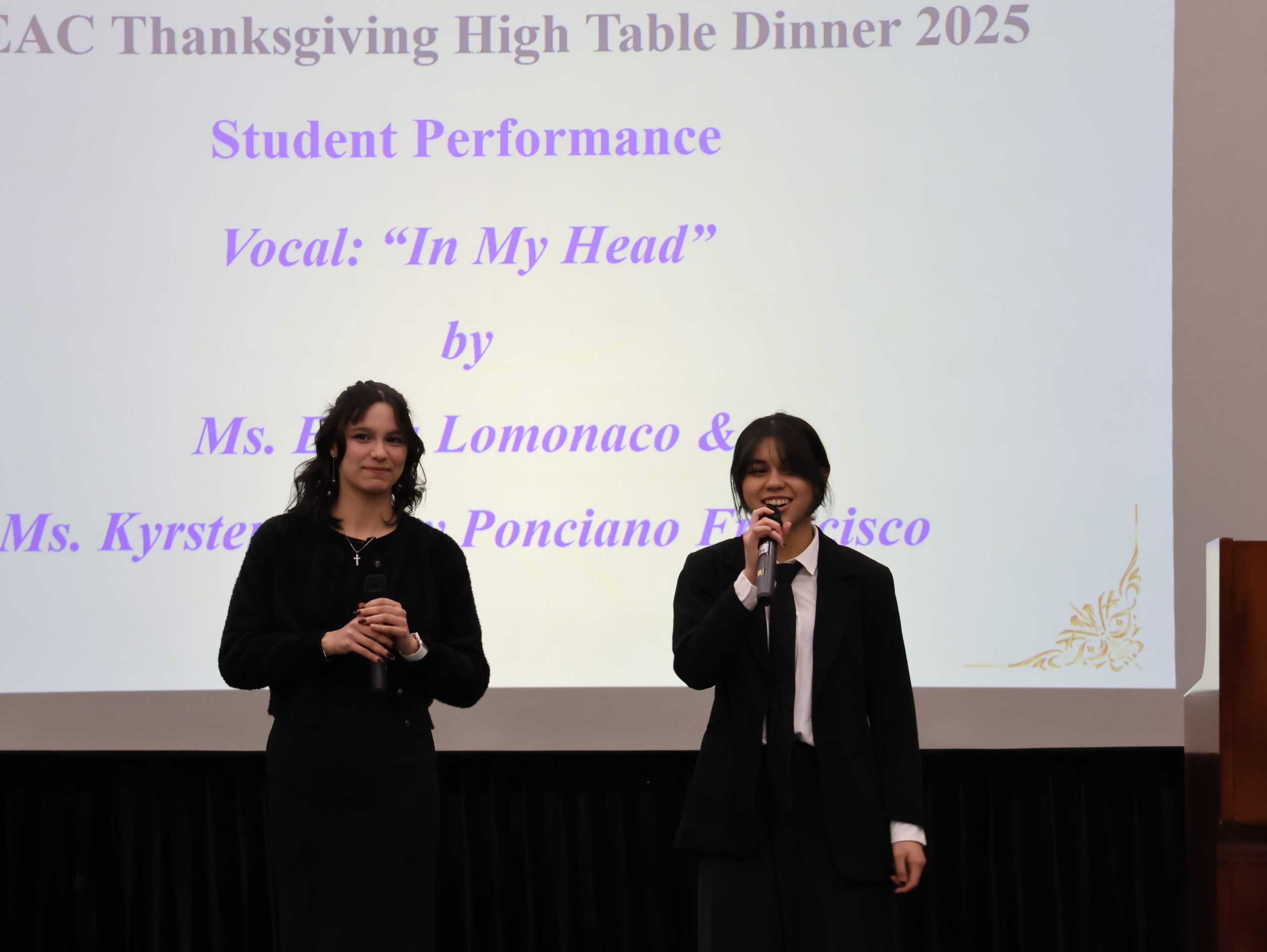 晚宴上,四位一年級學生帶來精彩表演:孔祉穎同學與何沛思同學以鋼琴、結他伴奏並演唱了《Best Part》;Erica Lomonaco同學與Kyrsten Ashley Ponciano Francisco同學演唱《In My Head》,贏得滿堂掌聲。表演後,賓客們在甜品與賓果遊戲中度過了愉快的時光。