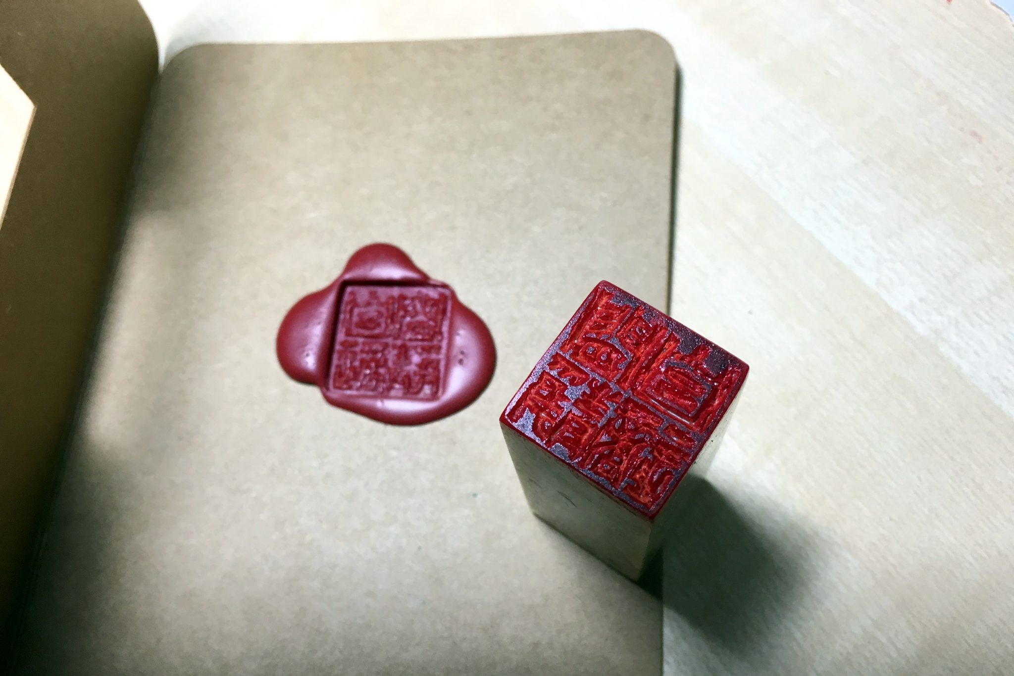 The first two sessions featured the “red” seal carving. Dipped in a red ink pad and then stamped on a white paper, the lines of the characters are printed in red. Due to more technical processes involved, Gigi chose a small seal stone for students to carve one character. Each of the seals was charmingly attached with a string so that it could become a necklace. In the third and fourth classes, students learned to create “white” seals (the characters would be shown with its background in the ink colour such as red). Since this method requires no border processing, the techniques are simpler. Participants carved three or four characters, and applied the wax seal to do the stamp, giving a fusion of Chinese and Western traditions.