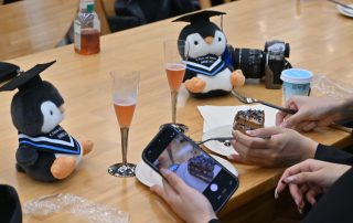 Penguin pals for life: graduating students celebrate with their SHEAC mascot doll keepsake in hand.