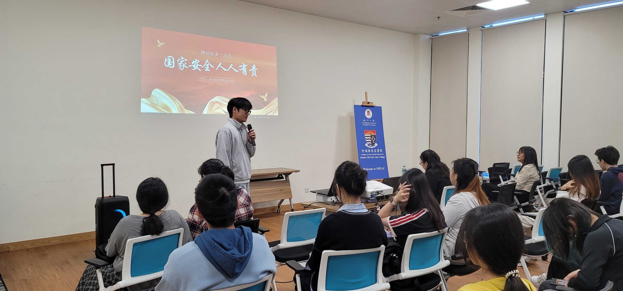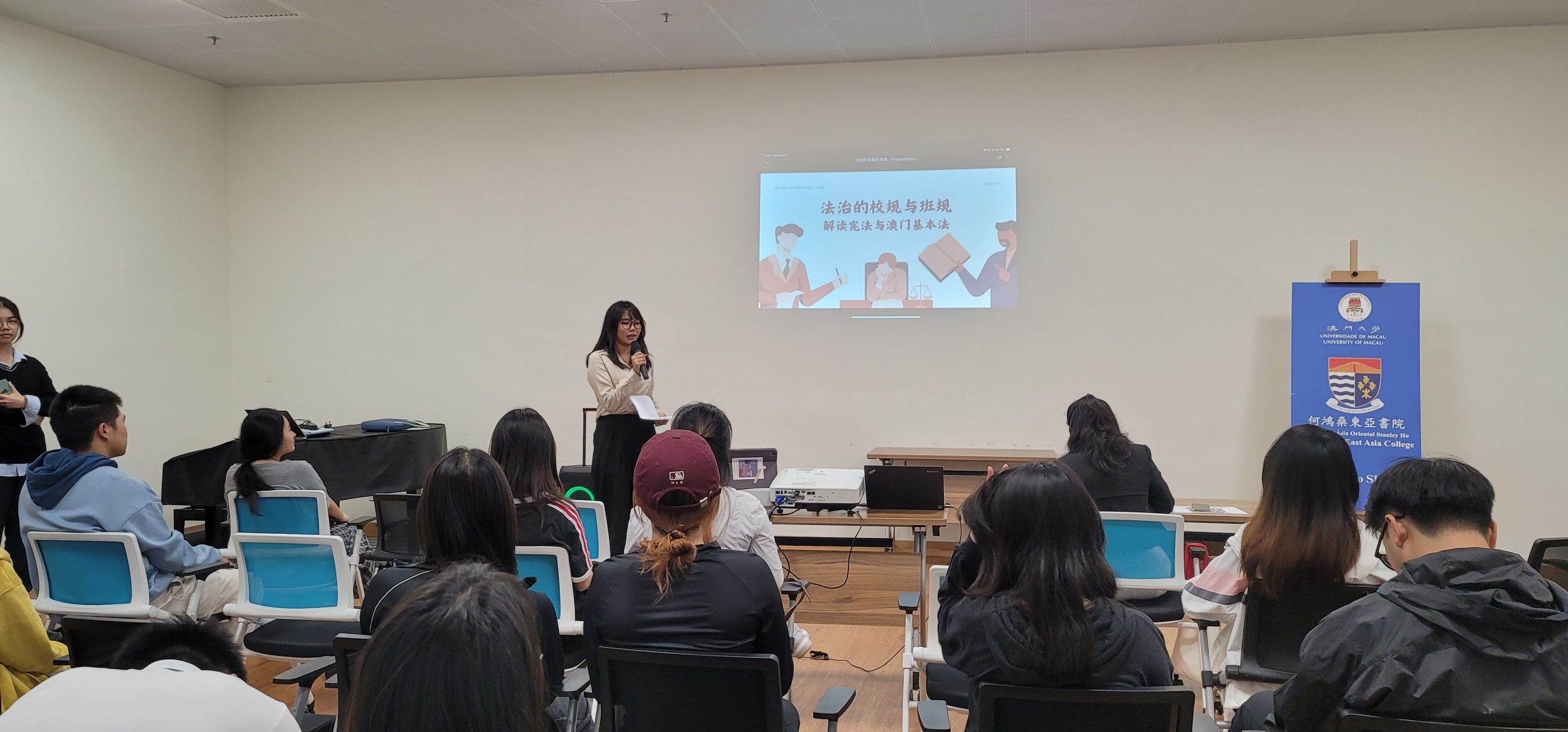 On the afternoon of November 5, 2025, six “Two Laws” trainees from Stanley Ho East Asia College, University of Macau successfully conducted a trial lesson after participating in UM Excellent trainee course for the promotion of the Constitution and Basic Law. The course was jointly organised by UM’s Centre for Constitutional Law and Basic Law Studies, ten residential colleges of the university, and local association Divulgação da Associação de Lei Básica de Macau.