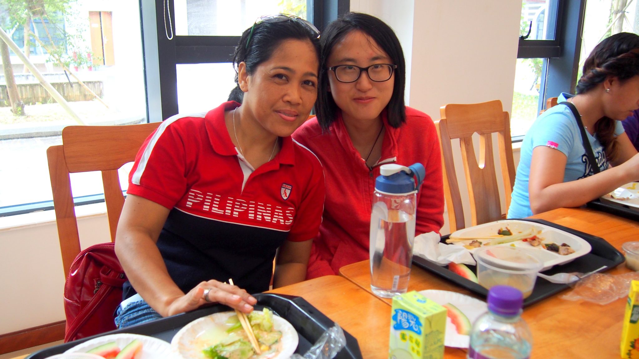 參觀完書院之後,三組訪客與義工們一起在書院的膳堂就餐,並且有三名書院同學進入膳食服務櫃檯內部幫忙,親身體驗廚房工作者工作的辛苦。戴上口罩與頭套的同學們表示心中仿佛多了一份神聖的責任感,在分發飯菜給書院的大小客人們時更是有一種滿足感充斥於心中。吃飯過程中,訪客們與義工聊得興高采烈,相互交流了解對方的基本背景和生活境遇。飯後,義工同學們代表書院向訪客們發送了零食以及印有東亞書院的冰箱貼作為紀念品,更有小黃人大人偶出現與孩子們玩耍。
