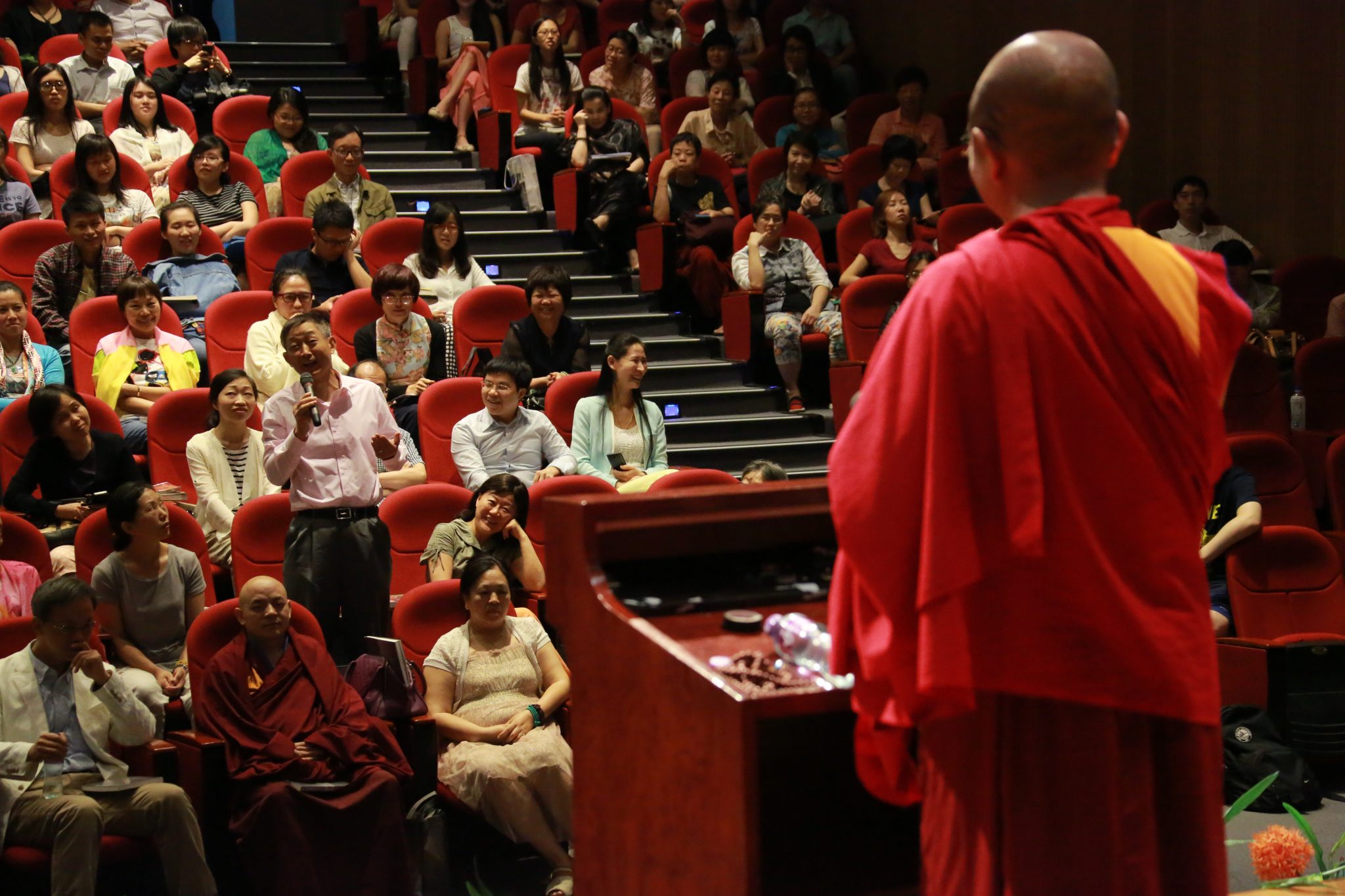 在之後長達一個小時的問答環節裡,聽眾們提出了很多尖銳又值得讓人反思的問題,例如:「在極端環境下,人為了生存只能獵殺動物,若非如此,則不能存活下去,人該怎麼辦?」,「在西藏旅行時,為正在辯經的僧侶拍照,卻反被其收拍攝費,這樣的現象似乎與佛教的形象格格不入,這該如何解釋?」等等,堪布都能用幽默機智的話語一一為其解答。