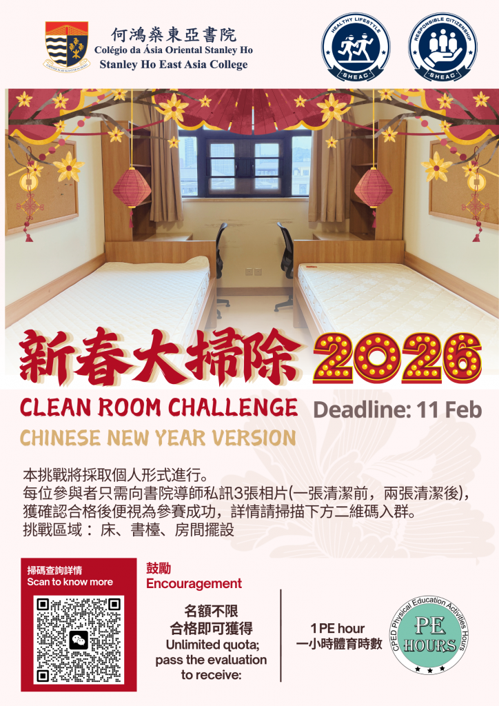 Last year’s “Clean Room Challenge” was a huge success! With three events held, over 240 SHEACers participated, beautifying their “second home” and improving their quality of life. This year, we are continuing with this Chinese New Year Version and starting a brand new year together!
